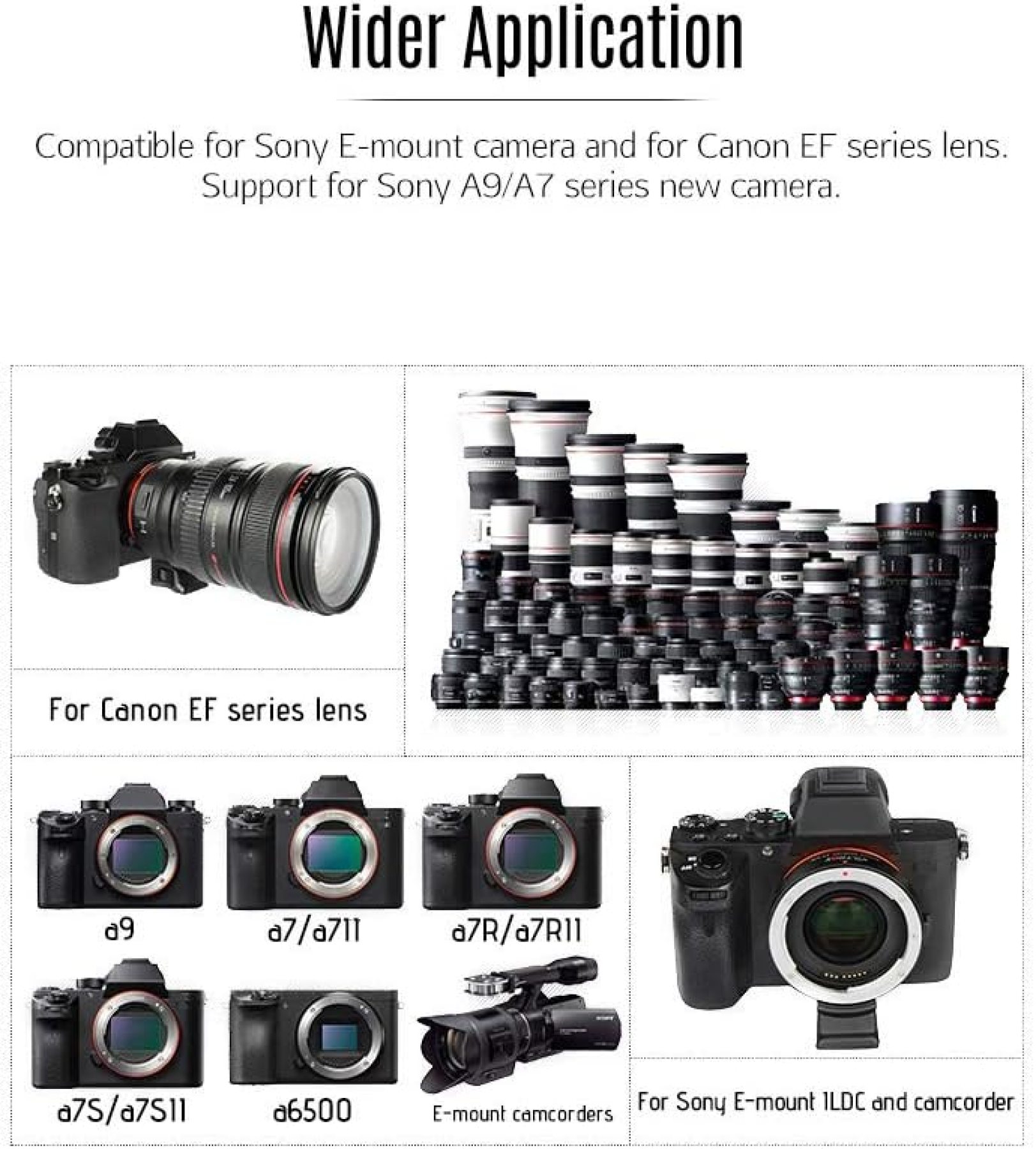 Wide Compatibility: Adapts Canon EF series lenses for use on Sony E-Mount APS-C cameras Auto Focus Support: Compatible with CDAF and PDAF for fast and accurate focusing 0.71x Focal Length Multiplier: Reduces focal length and increases focusing speed by up to 50% Enhanced Aperture Performance: Built-in 4-group 4-glass optics increase aperture by 3 stops for better subject isolation and background blur Gold-Plated Copper Contact: Ensures smooth EXIF signal transmission for accurate metadata display Durable Build: Made from CNC precision-machined aluminum for long-lasting use USB Upgrade Support: Allows firmware updates to ensure compatibility with future lenses and cameras